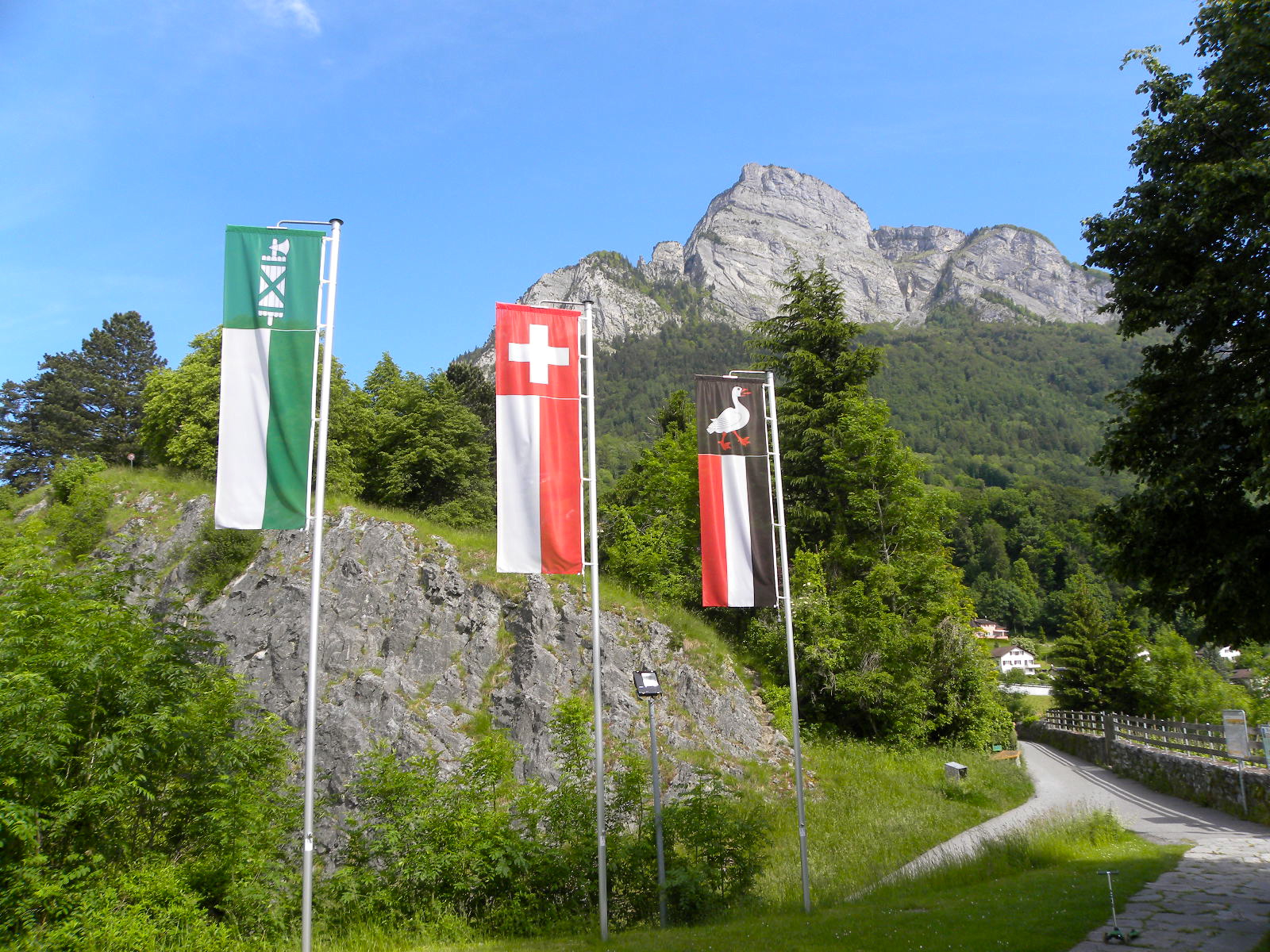 Widok z pagórka Splee na Gonzen. Między pierwszym i drugim szczytem widoczna kamienna figura. Flaga kantonu St. Gallen, flaga szwajcarska oraz flaga z gęsią.
