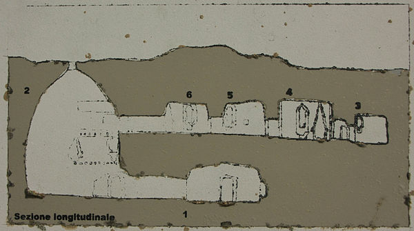 Przekrój góry. Na pierwszym piętrze pomieszczenia prowadzące do głównej jaskini